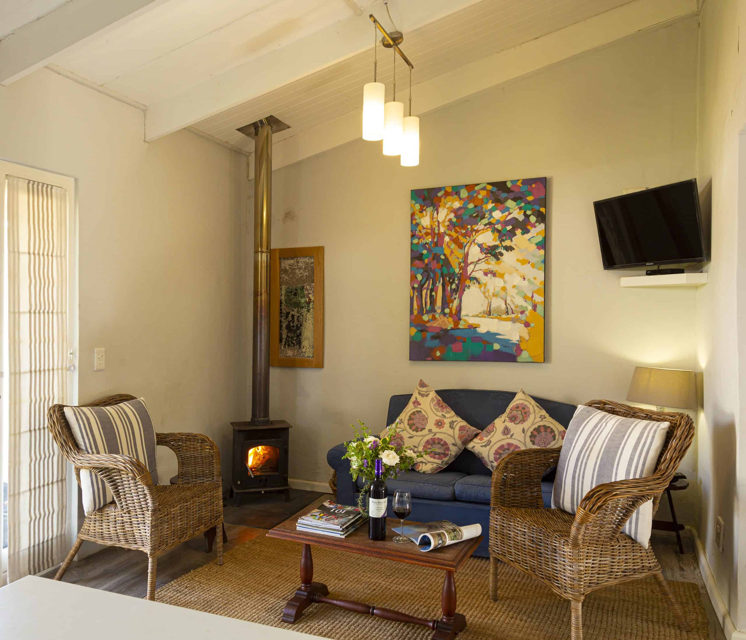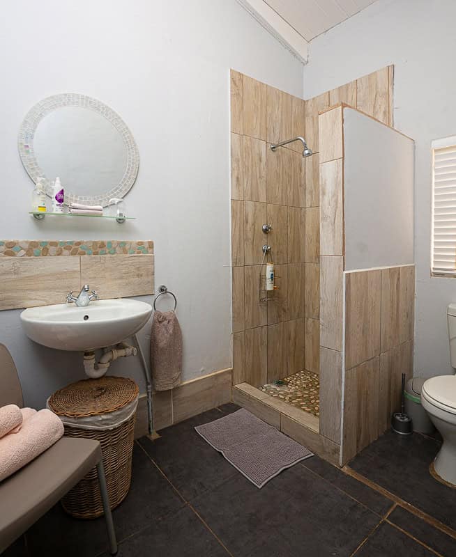 The open-plan kitchenette has seating and a built-in outdoor braai and is equipped with a 4-plate hob, microwave, and a fridge with a small freezer compartment. The living area provides a full DSTV package and free unlimited Wi-Fi.